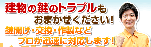 お店の鍵を失くした、家の玄関の鍵を交換したい、もうひとつ鍵を付けたいなど、鍵のトラブル・お困りごとならおまかせください。365日年中無休で駆けつけます!